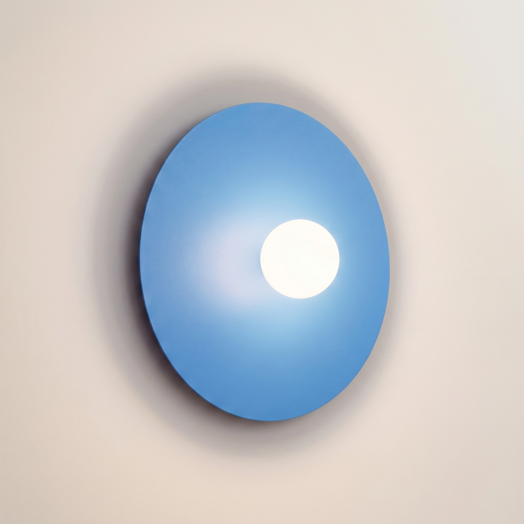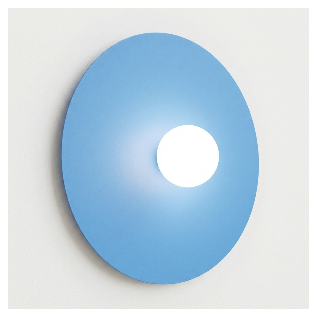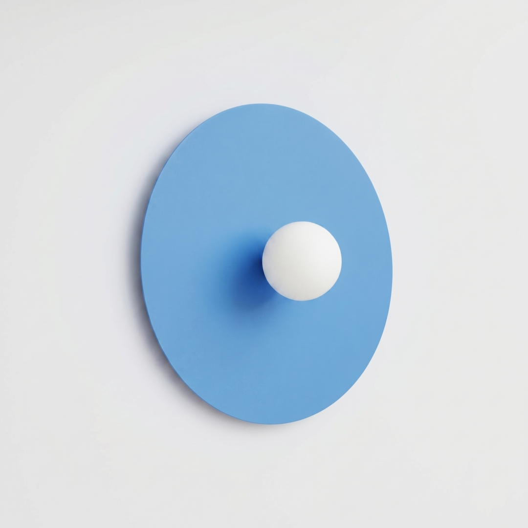 AKE 50 lampa ścienna harmonijnie łączy uniwersalną formę z przyjaznym światłem i niebanalną kolorystyką. Okrągły metalowy dysk i mleczna kula tworzą minimalistyczną, a zarazem wyrazistą kompozycję światła i koloru.