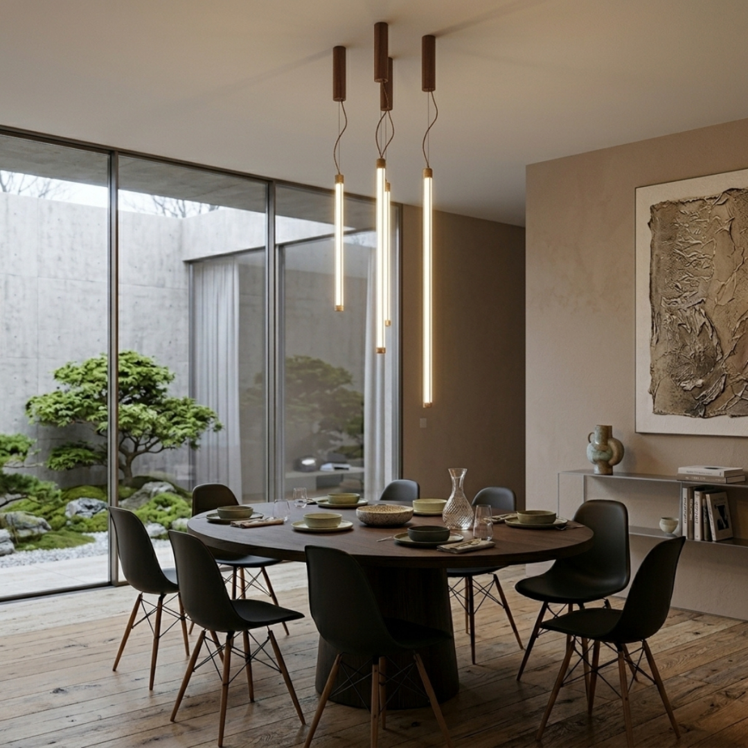Kolekcja TRANG obejmuje lampy wiszące w wariantach 50, 75 i 100 cm oraz lampę podłogową, dzięki czemu pozwala zachować spójność w różnych strefach wnętrza. Jej smukła sylwetka, czyste linie i wyważone proporcje podkreślają nowoczesny charakter projektu. Oprawy są dostępne w palecie 19 kolorów, co daje duże możliwości aranżacyjne. Ważnym atutem kolekcji jest także zintegrowane sterowanie PUSH-DIMM/DALI, które pozwala wygodnie regulować natężenie światła i lepiej dopasować oświetlenie do funkcji wnętrza oraz pory dnia.